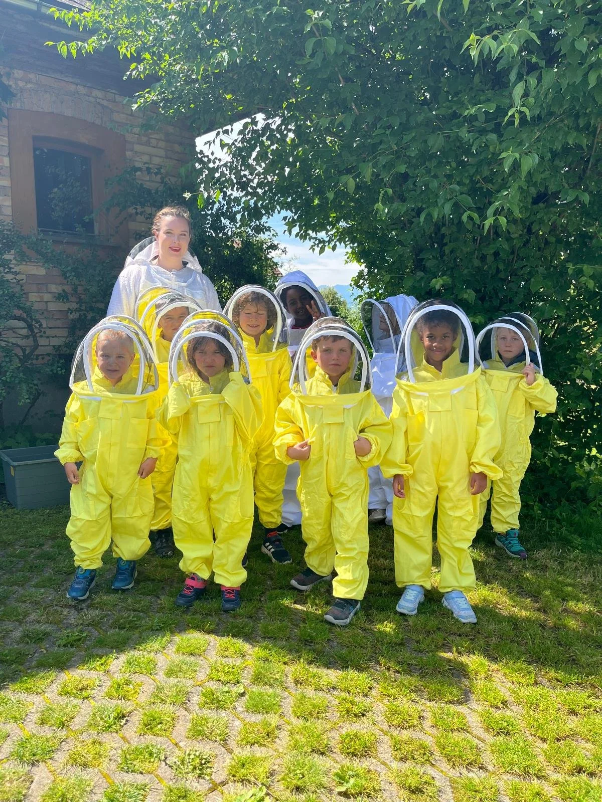 Die Bienen sammeln den Nektar von Blüten und tragen ihn in ihren Honigstock. Dort wird der Nektar zu Honig verarbeitet und in Waben gelagert. Die Imker ernten den Honig, indem sie die Waben aus dem Bienenstock entnehmen und den Honig schleudern.